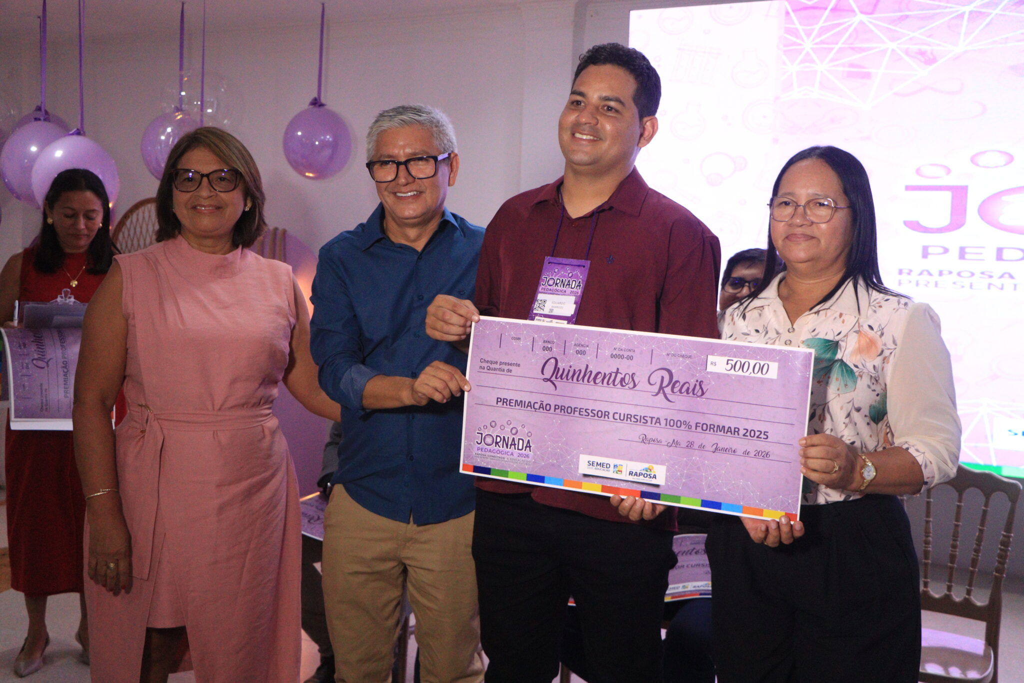 Durante o encontro pedagógico, também foi realizada a premiação dos cursistas do Núcleo de Formação e Melhorias da Aprendizagem em Raposa (FORMAR), referente ao 1º e 2º semestres de 2025. O momento também contou com sorteios de tablets, televisão, valores em pix e duas viagens para Maceió.